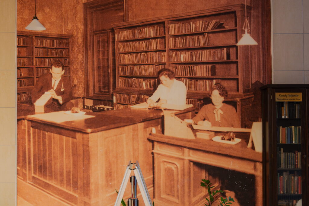 KSz: 2005-ben fölújították az egész könyvtárat. Itt, ahol mi ülünk, egy lépcső volt lefele. Aki itt bejött, és balra ment, a gyerekkönyvtárba jutott. Jobbra pedig a felnőtt rész volt, külön személyzettel. A fűtéssel gondok voltak, azt is korszerűsíteni kellett. A felújítás során kapták meg a falak és a berendezés ezt a bordós-narancssárgás színvilágot is. Akkor vetődött fel, hogy új nevet is kaphatna az intézmény. A Karinthy Frigyes út áll, a közelben két helyen is laktak a Karinthyak, és itt van az egykori törzshely, a Hadik is, evidens volt tehát a választás. Karinthy Márton, Frigyes unokája ekkor ajánlotta fel a könyvtárnak a bejáratnál most is látható Karinthy-gyűjteményt.